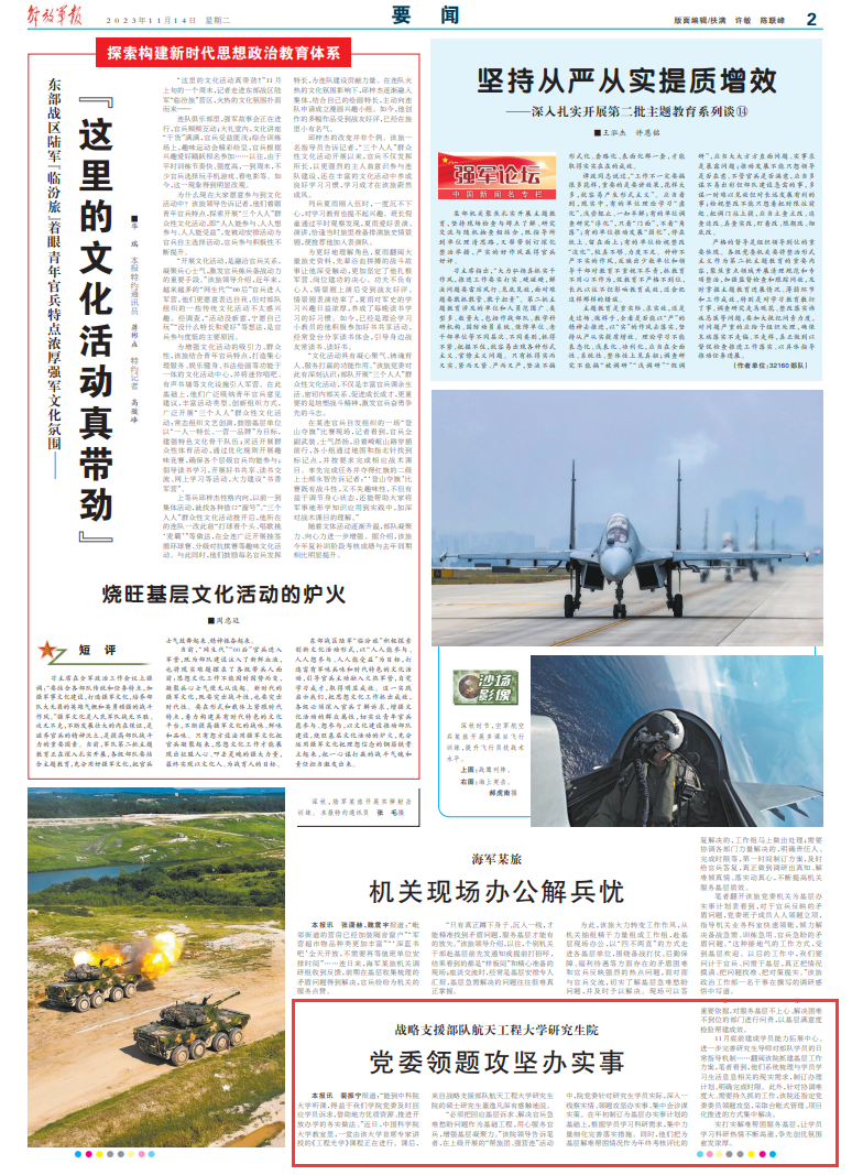 11月底前建成学员能力拓展中心、进一步完善研究生导师对部队学员的日常指导机制……翻阅该院抓建基层工作方案,笔者看到,他们系统梳理与学员学习生活息息相关的现实需求,制订办理计划、明确完成时限。此外,针对协调难度大、需要持久抓的工作,该院还指定党委委员领题攻坚,采取台账式管理、项目化推进的方式集中解决。
