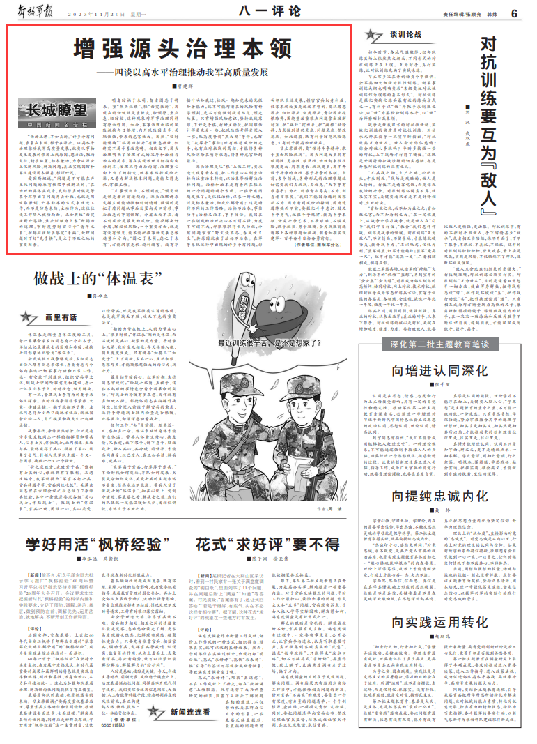 “扬汤止沸,不如去薪。”许多矛盾问题,表象在末端,根子在源头。以高水平治理推动我军高质量发展,就要从事物发生发展的根源上找原因、想办法,靶向定位、精准施策、标本兼治,力争从源头上化解风险、解决问题,真正实现国防和军队建设固本强基、根深叶茂。