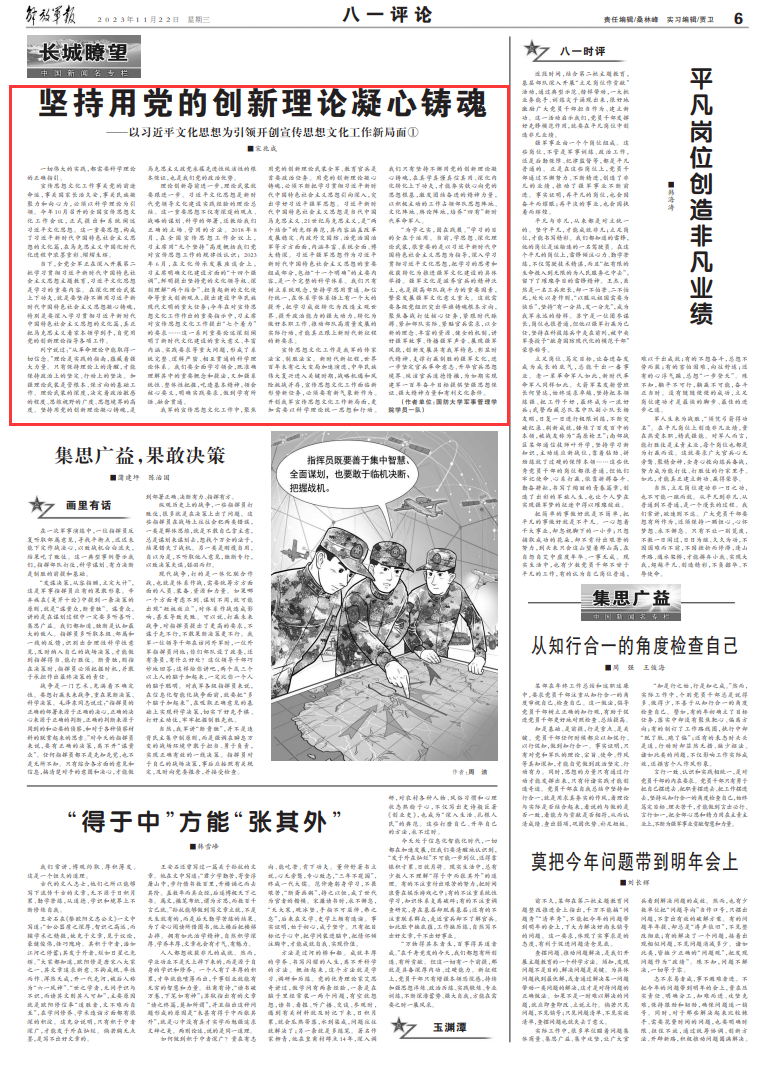 宣传思想文化工作是我军的传家法宝、制胜法宝。新时代新征程,世界百年未有之大变局加速演进,中华民族伟大复兴进入关键时期,战略机遇和风险挑战并存,宣传思想文化工作面临新形势新任务,必须要有新气象新作为。开创我军宣传思想文化工作新局面,更加需要以科学理论统一思想和行动。我们只有坚持不懈用党的创新理论凝心铸魂,在真学真懂真信真用、深化内化转化上下功夫,才能夯实铁心向党的思想根基,激发团结奋进的精神力量,以积极主动的工作占领部队思想阵地、文化阵地、舆论阵地,培养“四有”新时代革命军人。