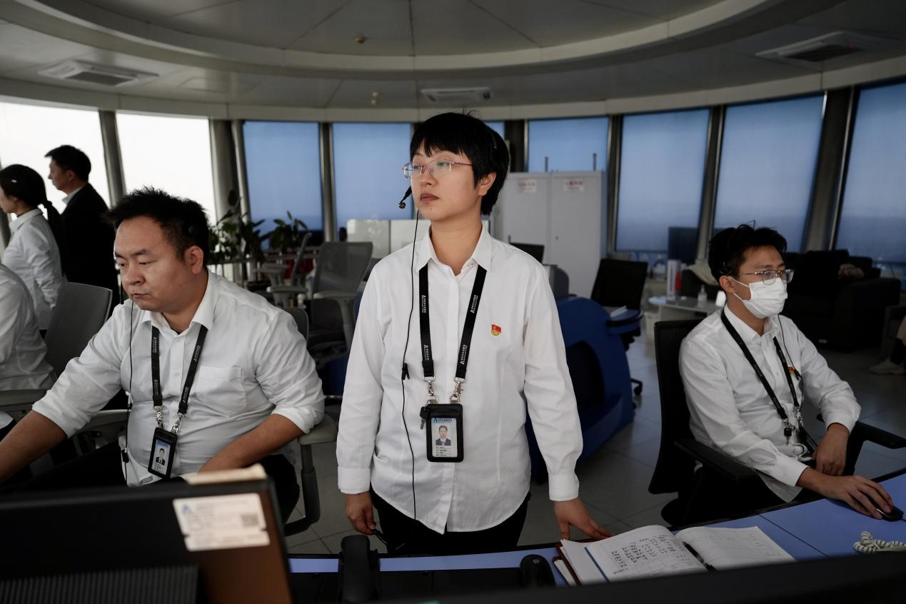 在东北空管局沈阳塔台内,作为当天塔台管制席的主班,成馨全神贯注地盯着屏幕上的圆圈信号。“到了!”她向当天管制席的副班曹航点头示意,站起身,举起话筒: