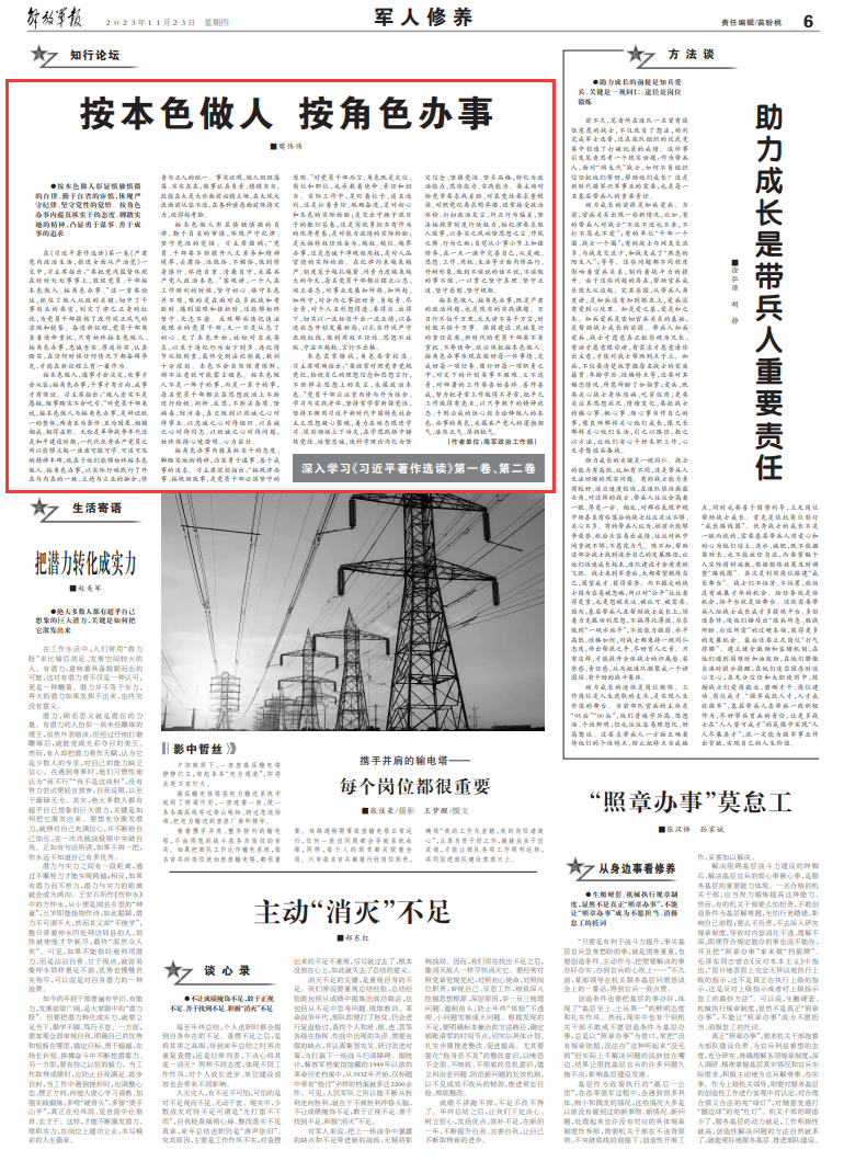 在《习近平著作选读》第一卷《严肃党内政治生活,推进全面从严治党》一文中,习主席指出:“要把党内监督体现在时时处处事事上,敦促党员、干部按本色做人、按角色办事。”这一重要论述,抓住了做人从政的关键,切中了干事创业的要害,划定了律己正身的红线,为党员干部提供了改作风正风气的准绳和镜鉴。奋进新征程,党员干部肩负着使命重托,只有始终按本色做人、按角色办事,忠诚老实、厚道朴实、认真踏实,在任何时候任何情况下都奋楫争先,才能在新征程上有一番作为。