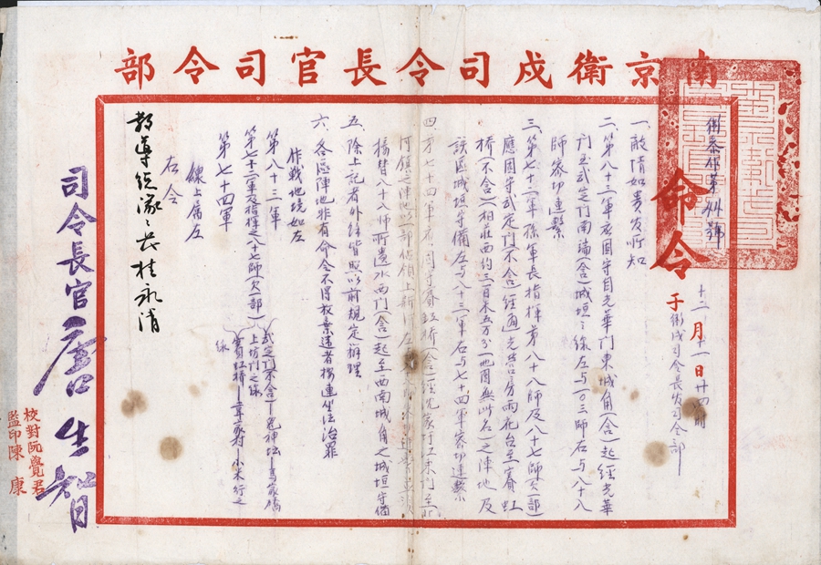 “完整的作战命令文本十分稀缺,这份史料使我们对卫戍长官司令部所发作战命令的数量、指挥模式及撤退前的部署,有了清晰了解。”江苏省社会科学院研究员孙宅巍说。