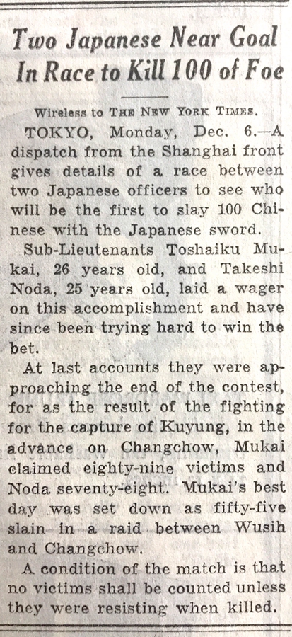 “根据《东京日日新闻》报道,两名日本军官比赛看谁能先杀死100名中国士兵,结果都杀了超过100人,双方打平杀了106人,他们又同意重新比赛杀到150人为止,12月6日是89比78,12月1日是56比26。”这是1937年12月14日发行的《芝加哥每日论坛》中,一篇有关两名日本军官进行“百人斩”杀人竞赛的报道节选。