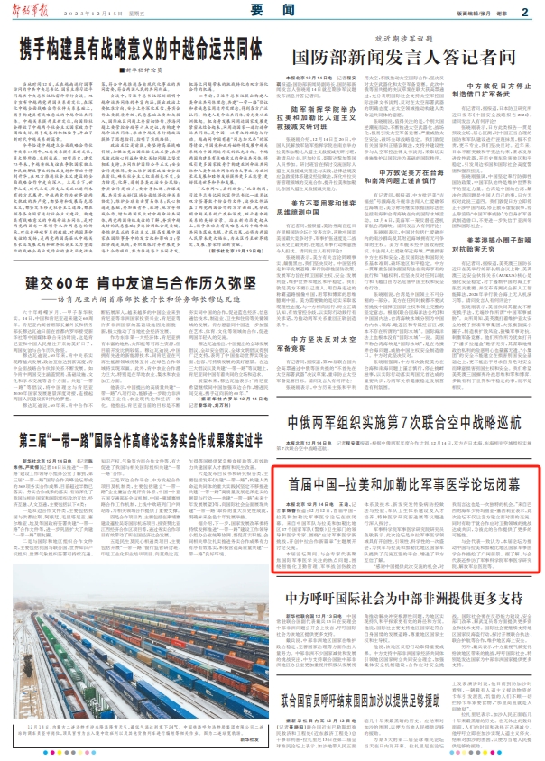 解放军报北京12月14日电 王迪、记者李姝睿报道:12月12日,首届中国-拉美和加勒比军事医学论坛在京闭幕。来自中国军队与拉美和加勒比地区17个国家军队(警察)卫生部门的领导和医学专家,围绕“应对军事医学新挑战,开创中拉合作新篇章”主题展开讨论交流。