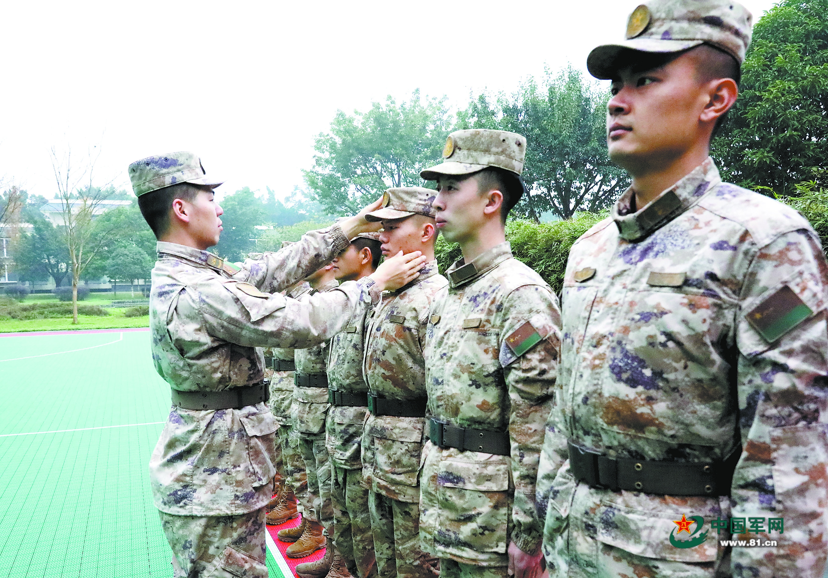 第七十七集团军某旅组织队列训练,班长涂洋(左一)为战友整理军容风纪。刘新垚摄