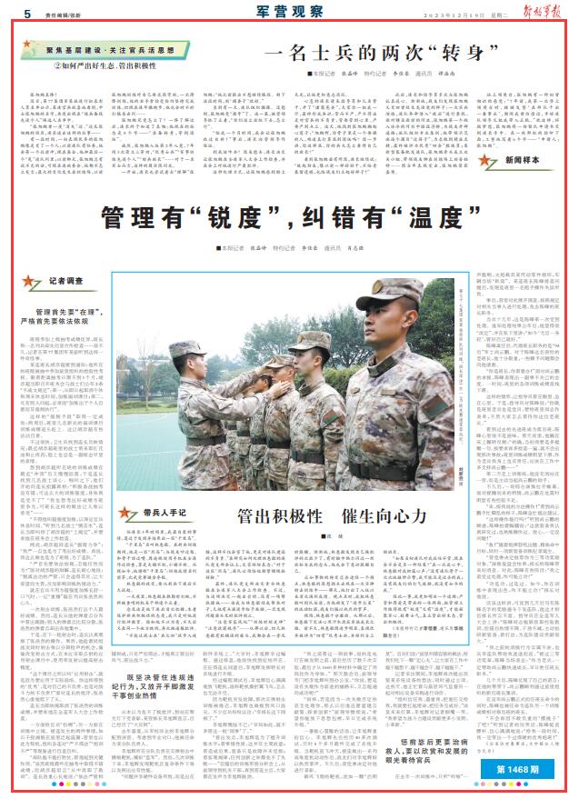 经此一事,我更加明白一个道理:严管和厚爱是带兵的一体两面,把管理工作做得既有“锐度”又有“温度”,才能凝聚军心、鼓舞士气,真正管出好生态、管出积极性。