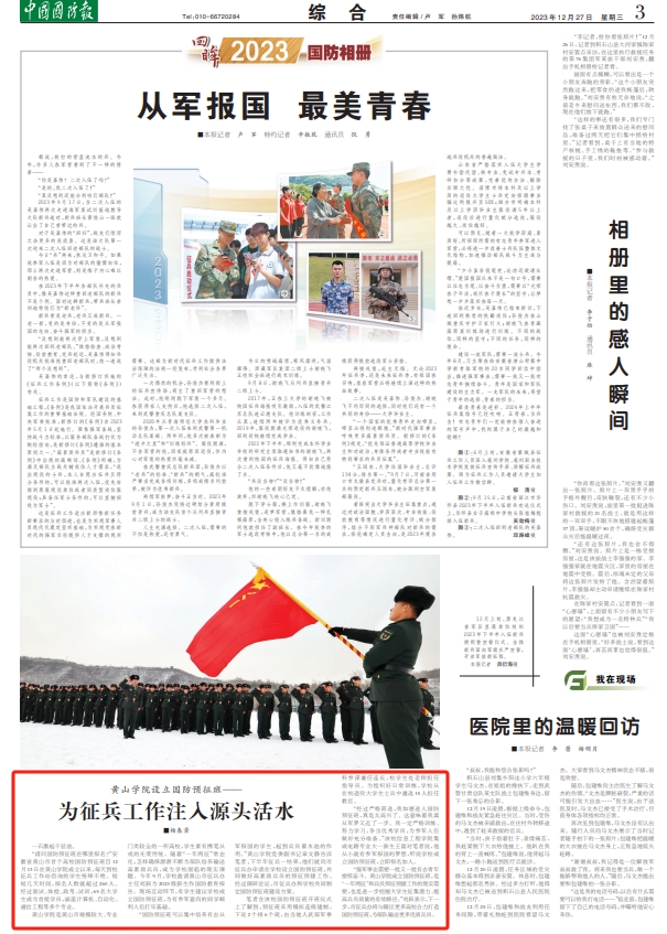 黄山学院是黄山市规模较大、专业门类较全的一所高校,学生素有携笔从戎的光荣传统。随着“一年两征”常态化,怎样确保源源不断为部队培养输送高素质兵员,成为学校面临的现实课题。今年9月,学校邀请黄山市征兵办主任刘跃为2023级新生作国防教育报告。现场互动环节,有学生建议学校成立国防预征班,为有参军意向的同学顺利入伍打牢基础。