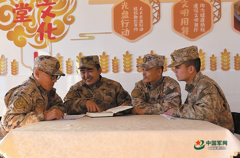 图为第81集团军某旅财务科助理员寇国锋(左二)为连队战士答疑解惑。何鹏刚摄