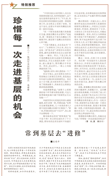 5月29日,“基层传真”版刊发了第81集团军某旅财务科助理员寇国锋的文章《珍惜每一次走进基层的机会》。在这篇自述里,寇助理员分享了他到连队蹲点前后的心理变化,讲述了一级上士刘海涛从兜里掏出几张皱巴巴的报销凭证时带给他的冲击,以及这次蹲点之后出台的一系列服务基层举措。