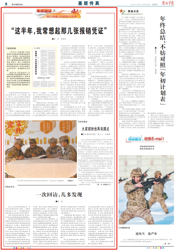值得一提的是,在过去这一年,也有不少机关干部登上我们的版面,分享自己当兵蹲连受到的触动、产生的思考和发生的改变,希望借报纸一角,与基层官兵进行“面对面”交流。
