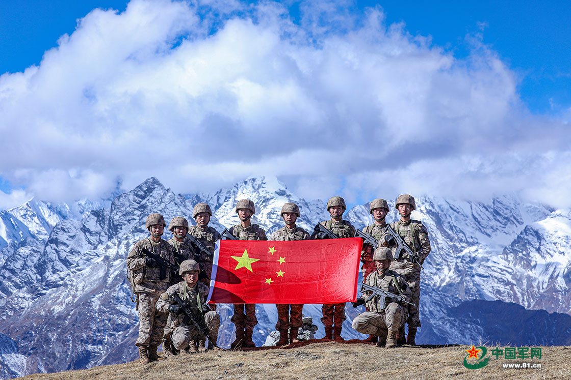 元旦期间,西藏军区吉隆边防连组织新年第一次巡逻。这是官兵到达点位展开国旗,与雪山合影。崔运红 摄