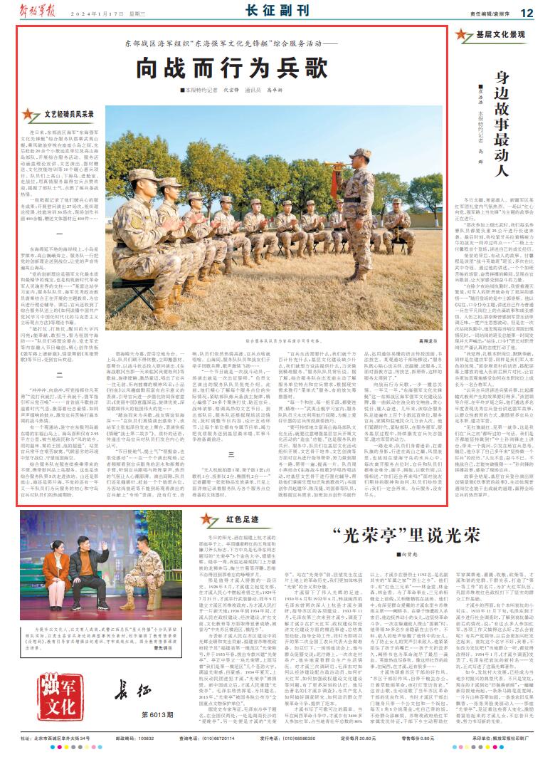 向战而行为兵歌,一步一履总关情。一年又一年,“东海强军文化先锋艇”这一东部战区海军强军文化建设品牌,像一曲跃动在浪尖的交响曲,赏心悦目、催人奋进。几年来,该综合服务队足迹遍布上百个小散远直单位,服务官兵、家属和驻地民众几万余人次。他们紧跟时代、紧贴部队,在服务强军、服务基层过程中,持续激发官兵矢志强军、建功军营的动力。