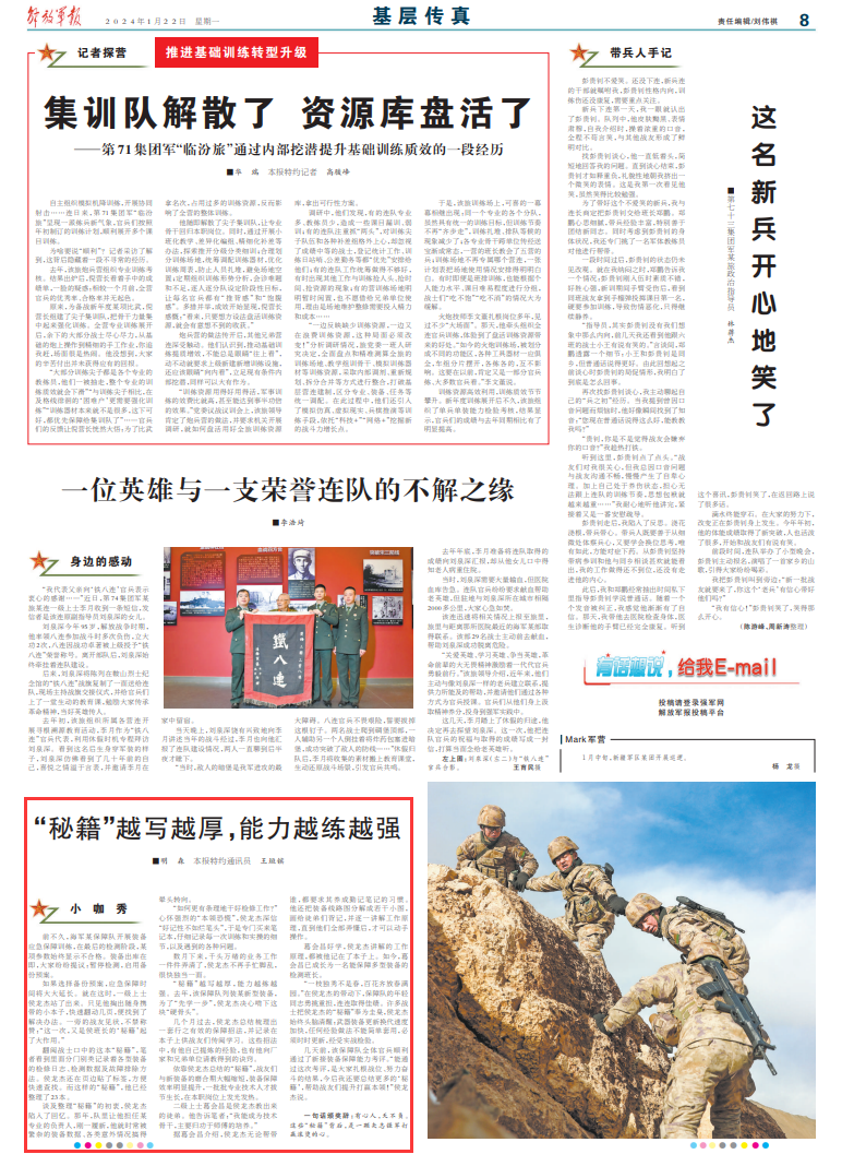 几天前,该保障队全体官兵顺利通过了新接装备保障能力考评。“能通过这次考评,是大家扎根战位、努力奋斗的结果,今后我还要总结更多的‘秘籍’,帮助战友们提升打赢本领!”侯龙杰说。