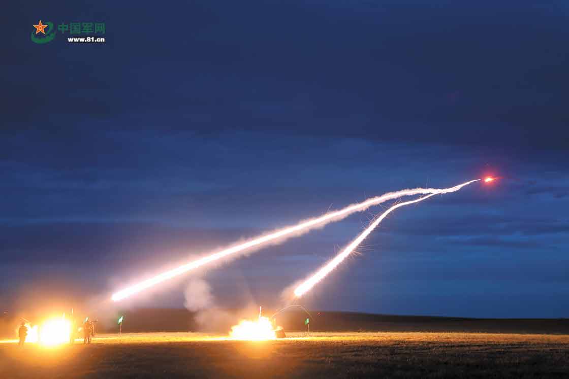 第79集团军某旅组织实弹射击训练。训练结束后,该旅立即开展装备保养工作。图为训练过程中,阵地火光四射,照亮夜幕。