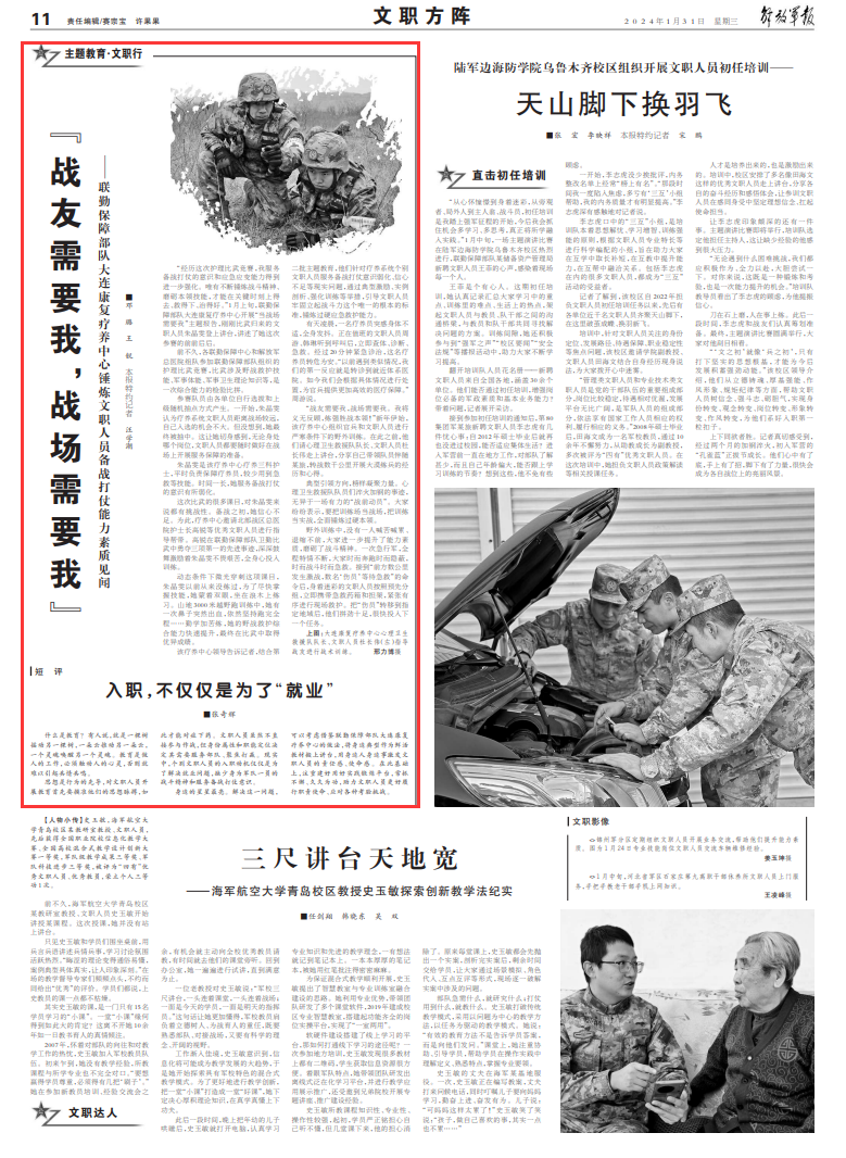 “战友需要我,战场需要我。我将义无反顾,练强胜战本领!”新年伊始,该疗养中心组织官兵和文职人员进行严寒条件下的野外训练。在此之前,他们请心理卫生救援队队长、文职人员杜长伟走上讲台,分享自己带领队员伴随某旅,转战数千公里开展大漠练兵的经历和心得。