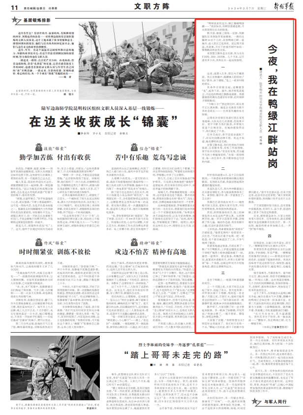 “鸭绿滚滚向远方,锦江巍峨绵国疆……”夜凉如水,耳畔回荡着连歌,月光照亮哨位女兵的脸庞。