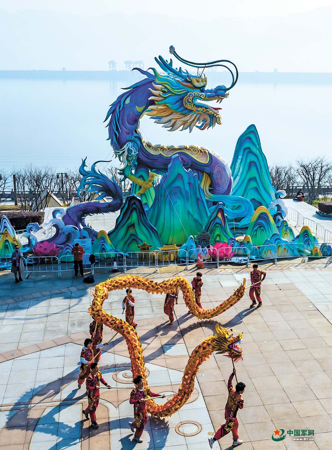 2月12日,湖北省宜昌市秭归县非遗传承人和民间艺人在三峡大坝前为当地居民和游客表演舞龙。新华社发