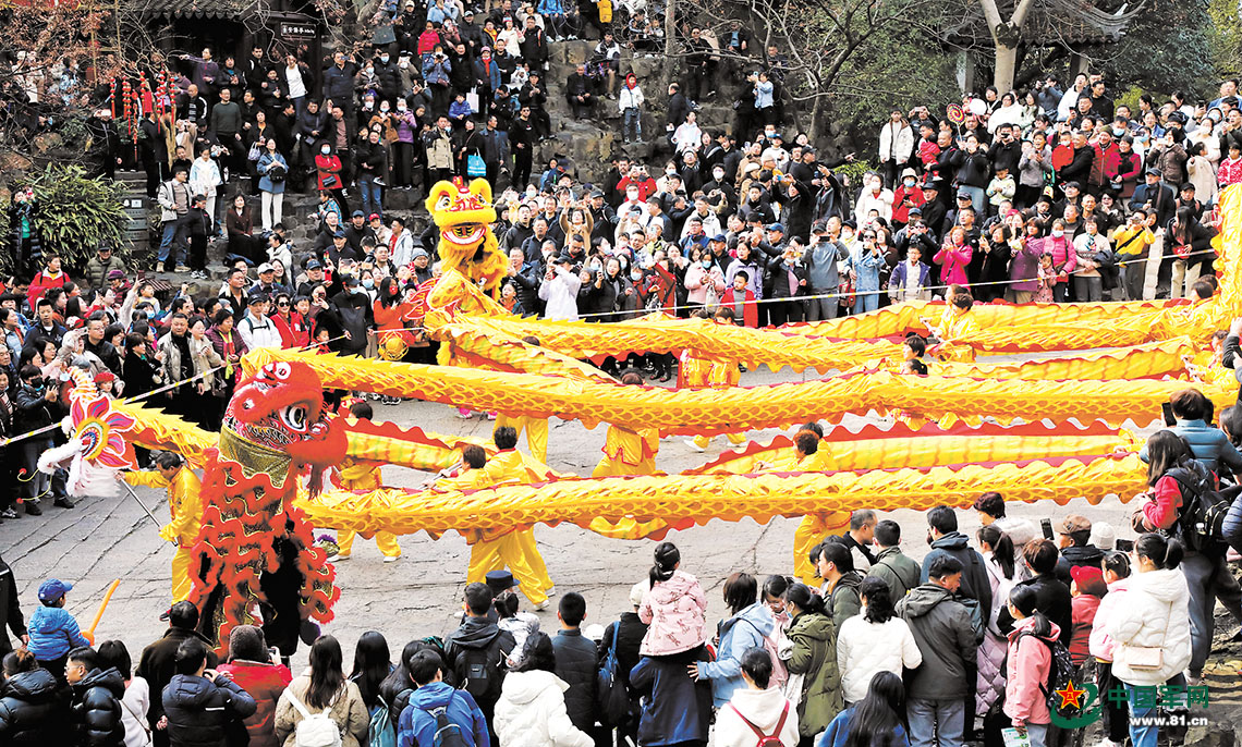 2月13日,游客在江苏苏州虎丘新春庙会上观看舞龙舞狮表演。新华社发