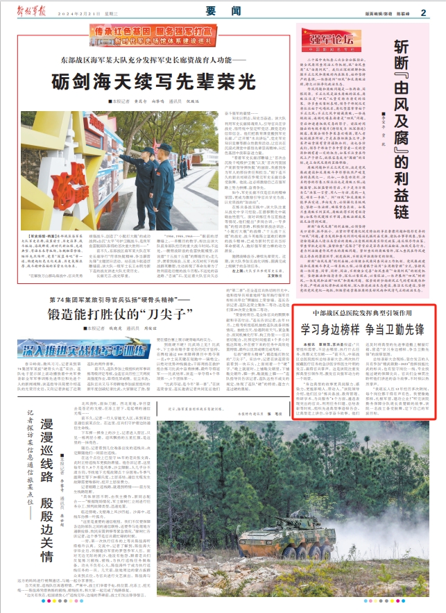“身边典型的故事更具说服力、感染力,更能影响人、带动人。”该院领导介绍,他们区分“练兵备战、教育管理、科研学术、为兵服务”4个方面,遴选表现突出的官兵,利用任务归建、总结表彰等时机,组织先进典型事迹报告会,让典型走上讲台,分享奋斗故事。他们还及时将典型的先进事迹搬上橱窗灯箱,营造“学习身边榜样、争当卫勤先锋”的浓厚氛围。