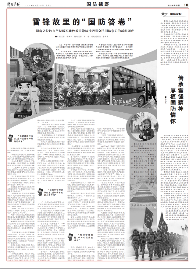 雷锋是从人民军队成长起来的伟大共产主义战士,雷锋精神是中国共产党人精神谱系的重要组成部分,是我党我军光荣传统和优良作风的集中体现。新时代新征程上,传承雷锋精神对于厚植国防情怀具有重要意义。