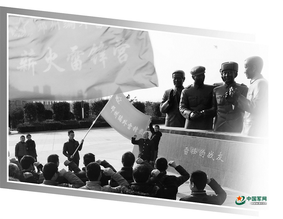 2月28日,“薪火营”老兵在邓州编外雷锋团展览馆前集结。面对“雷锋的战友”雕像,他们再次举起右拳,重温当年誓言。