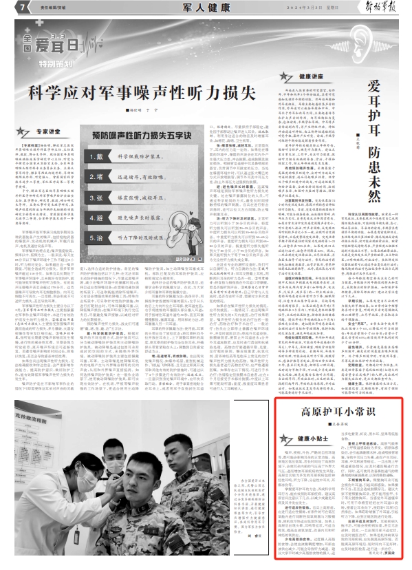 掌握爱耳护耳的方法、养成科学用耳行为,能有效预防耳部疾病。建议高原官兵注意以下几点,以减少或避免耳病及其并发症发生。