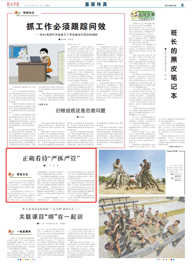 会后,该连连长找到李副班长说明缘由,他很快认识到自己工作中存在的问题。与此同时,该连利用教育时间讲清,干部骨干要本着为战斗力负责、为单位建设发展负责的态度开展工作,坚持原则、大胆管理,其他同志要正确看待干部骨干的“严抓严管”,积极配合。