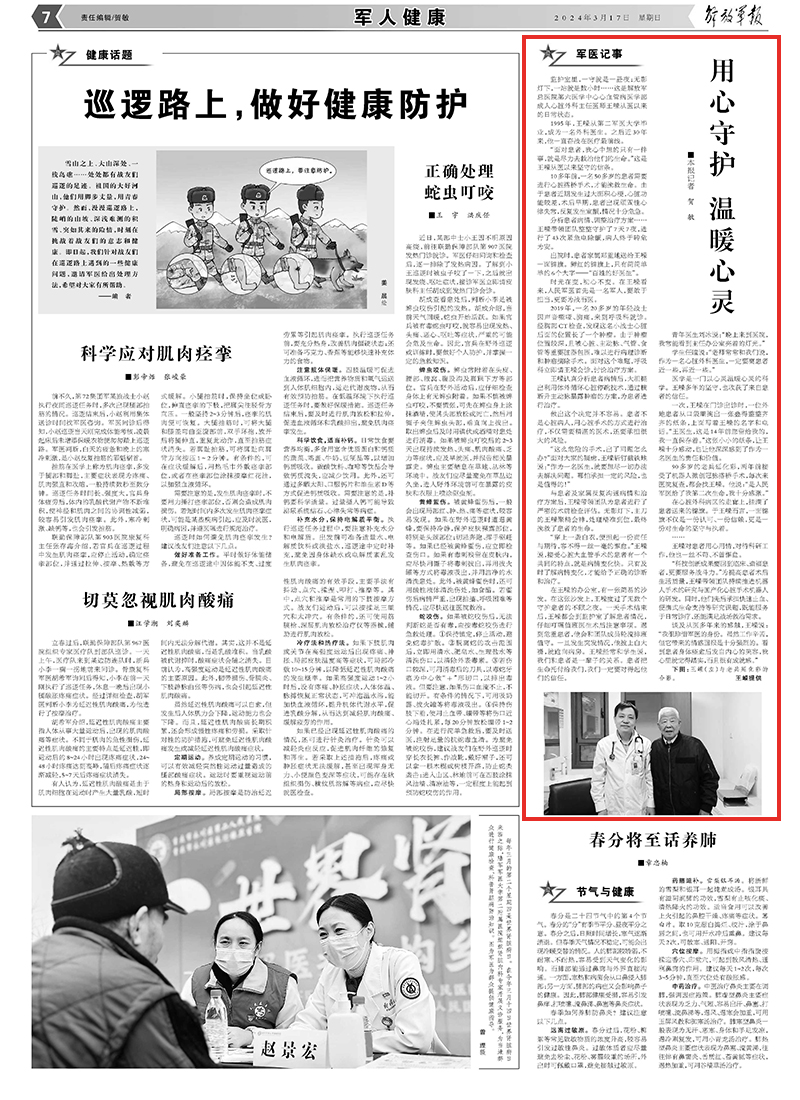 谈及从医多年来的感触,王嵘说:“我很珍惜军医的身份。虽然工作辛苦,但它带来的情感回报是十分强烈的。看到患者身体痊愈后发自内心的笑容,我心里就觉得踏实,而且很有成就感。”