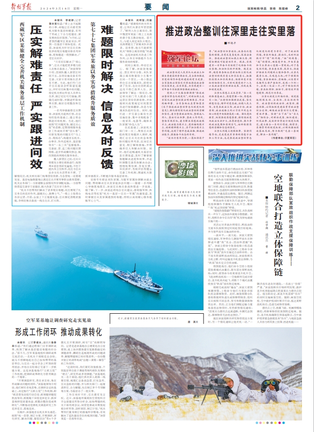 党的二十大报告强调要“推进政治整训常态化制度化”,对新征程上我军深化政治整训提出明确要求、作出战略部署。全军各级认真贯彻落实《关于推进政治整训常态化制度化的意见》,强化持续深化政治整训的清醒和坚定,着力整肃政治纲纪、整顿选人用人、整治行业积弊、整改工作作风、整饬军规军纪,着力解决思想改造跟不上、政治能力跟不上、党性锤炼跟不上、创新精神跟不上、实干担当跟不上等问题,达到了铸牢忠诚品格、锻造政治能力、提振奋斗状态的目的。