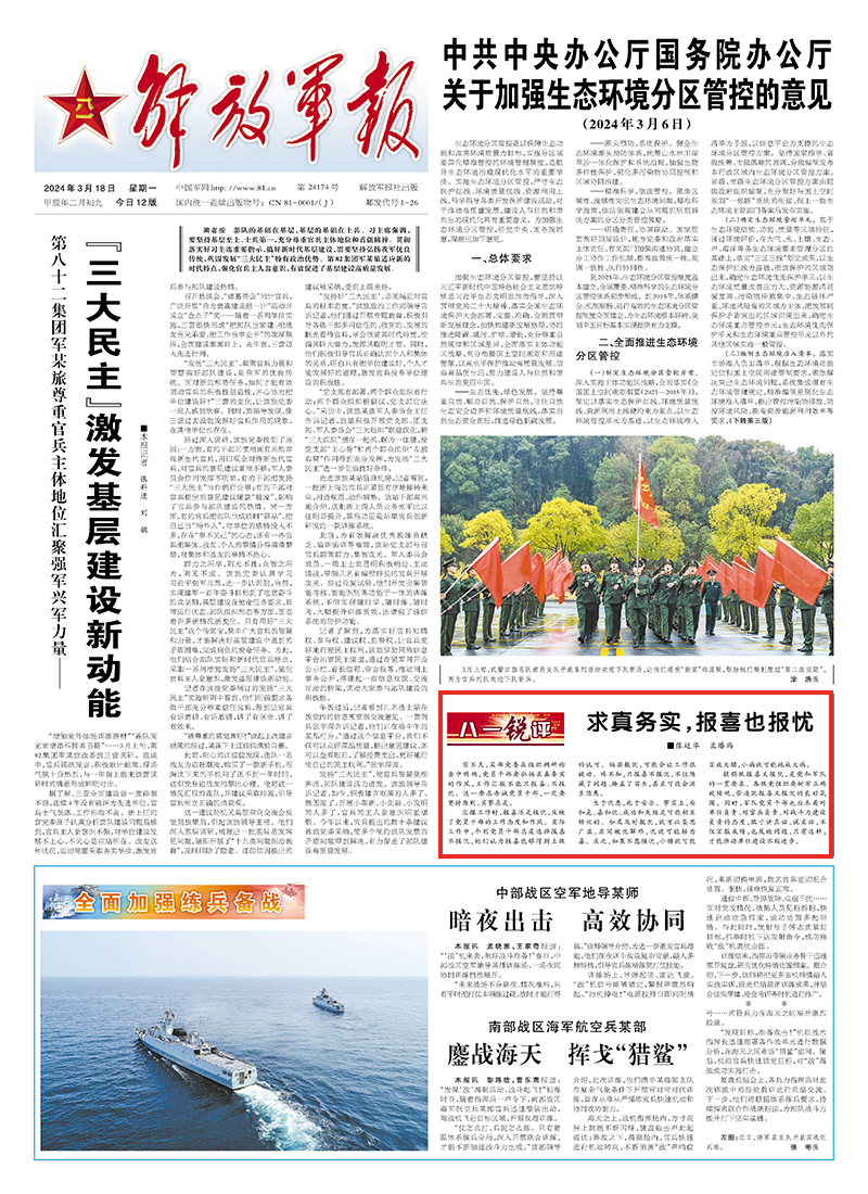 提倡既报喜又报忧,是党和军队的一贯要求。各级党组织要树牢正确政绩观,营造既报喜又报忧的良好氛围。同时,军队党员干部也应本着对单位负责、对官兵负责、对战斗力建设负责的态度,敢于讲真话、说实话,不仅汇报成绩,也反映问题,只有这样,才能推动单位建设不断进步。
