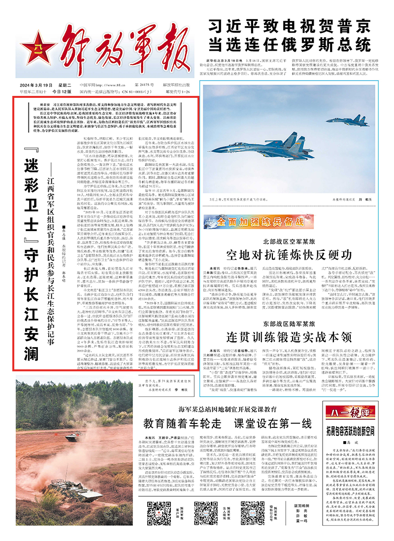 极目赣鄱,水清岸绿、江豚逐浪的生态美景在长江重现。“习主席为长江经济带高质量发展擘画了蓝图。久久为功换来生生不息,在军民共同努力下,江西经济社会发展和生态文明建设形成良性循环。”江西省军区领导表示,他们将牢记为民宗旨,组织官兵和民兵积极助力长江流域生态保护和长江经济带高质量发展,为守护长江安澜贡献“迷彩力量”。