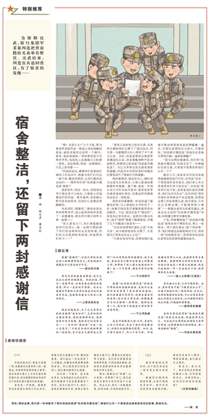 去年底,“抗洪救灾模范连”参加集团军英模连队比武,借住在“突击先锋连”的营房。离开之际,“抗洪救灾模范连”官兵不仅将宿舍打扫得干干净净,还留下了两封感谢信。