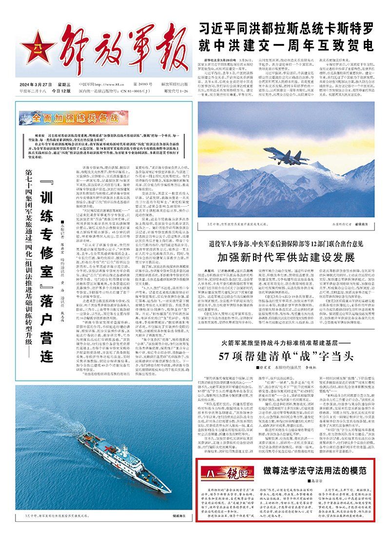 某部组织的“条令法规学习月”活动中,领导干部带头学习、带头钻研、带头参加实践活动,自觉做尊法学法守法用法的模范。在“关键少数”的带领下,该部官兵法治素养稳步提升,军营法治化建设进一步加快。