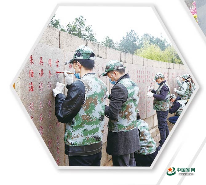 安徽省池州市“红色守护”行动志愿者为池州烈士英名墙描红。朱俊杰 摄