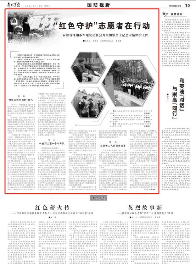 “红色守护”行动开展以来,1500余名志愿者发挥了重要作用,他们不仅积极参与祭扫保障工作,还挖掘整理出100余名烈士的故事,收录进《池州英烈故事汇》。池州市军地还联合在当地媒体开设“红色革命故事”专栏,广泛宣传英烈故事。