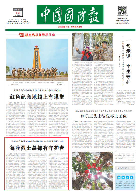 中国国防报讯 徐大鹏、特约记者乔振友报道:清明前夕,吉林省农安县烈士纪念设施守护志愿服务队例行巡察时发现,靠山镇革命烈士陵园碑文有褪色现象,立即将情况通报给县退役军人事务局。一天后,负责管护该镇陵园的民兵应急排和镇中心小学就组织民兵和学生对陵园进行维护。这是该县军地联合开展烈士纪念设施保护行动的一个镜头。该行动开展两年来,全县每一座烈士墓都有了守护者。