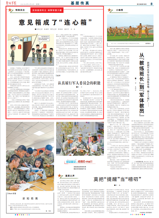 直到有一天,陈练发现大家提的意见内容变了:“连部的灯一直亮到深夜,希望连部同志注意劳逸结合”“近期天气变化无常,希望战友们及时增减衣物”……读罢,他哭笑不得:“这明摆是嘘寒问暖,算哪门子意见建议啊!”