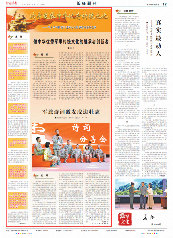 “一首首脍炙人口的传统军旅诗词,虽然历经千百年岁月洗礼,字里行间依然涌动着强烈的爱国之情、忧国之思和报国之志,是中华优秀军事传统文化的组成部分。”该团领导说,“蕴含在传统军旅诗词中的深厚战斗底蕴和家国情怀,让驻守边疆的我们从中不断汲取精神力量。”