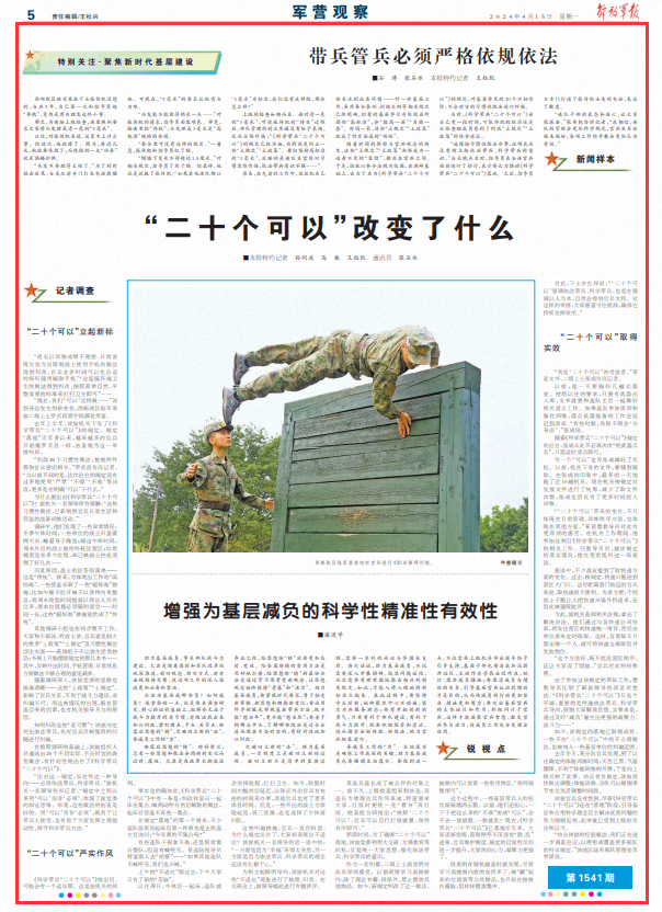在前期调研的基础上,该旅组织人员遴选出20个不切实际、不合时宜的典型做法,有针对性地出台了《科学带兵“二十个可以”》。