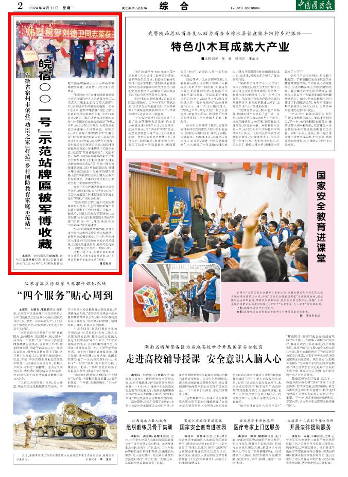 “皖宿001号”乡村国防教育家庭示范站牌匾的所有人是武警河南总队某支队二级上士张方方的父亲张叶林,家住宿州市灵璧县杨疃镇。去年2月以来,宿州军地依托“功臣之家”,打造乡村国防教育新阵地,为2019年以来,荣立三等功以上的功臣家庭悬挂“乡村国防教育家庭示范站”牌匾,当年,张方方荣立三等功,他家幸运地成为全市第一个挂牌家庭。挂牌之后,张叶林每天看着家门口“光荣之家”和“乡村国防教育家庭示范站”两块金灿灿的牌匾,高兴得合不拢嘴。特别是街坊邻居茶余饭后、农闲时节都喜欢到自家小院来聊孩子的部队生活,他感到“浑身都是劲儿”。无独有偶。2022、2023年连续两次荣立二等功的萧县籍军士许彬家挂牌“乡村国防教育家庭示范站”后,军地一同在他家建荣誉墙、国防角等配套设施,吸引乡里乡亲到他家中浏览国防报刊书籍、畅聊许彬参加国际比赛为国争光的光荣事迹。许彬的父亲许敬生还主动当起了国防教育宣传员。