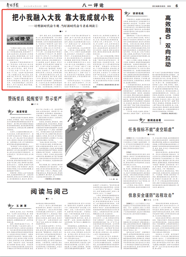 作家冰心说:“墙角的花!你孤芳自赏时,天地便小了。”囿于小我,眼前即是世界;心有大我,世界便在眼前。当代官兵大都是90后、00后,富有个性、充满自信、敢于逐梦,既有“少年心事当拿云”的壮志,也不可避免地会有“成长的烦恼”,在理想和现实、小我和大我等方面遇到思想困惑。个人梦连着强军梦,个人路通向强军路。无论顺境逆境,只要将个人奋斗的“小目标”融入强军事业的“大蓝图”,把个人奋斗融入民族复兴的历史洪流,与时代同步伐、与军队齐进步,就能以大我的格局突破小我之“小”、收获大我之“大”,更好地实现人生价值、升华人生境界。