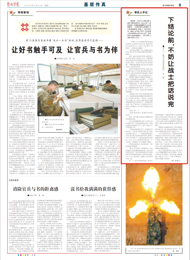 几天后的连务会上,我把这两件事和盘托出,希望大家引以为戒,没想到引起强烈共鸣。原来,在带兵过程中,很多干部骨干都有类似经历。分析讨论中,我们形成一个共识:带兵人要及时发现问题,可在下结论前,不妨让战士把话说完,充分了解事情原委,这样才能更好地避免曲解和误会。