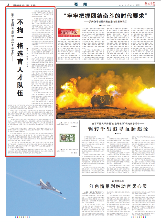 该旅领导介绍,为更好发挥骨干人才的辐射带动作用,他们按照“不拘一格识才、科学规划育才、精心统筹用才”思路,打破营连建制,整合人才资源,区分不同专业岗位建立“骨干苗子库”,为建设一支综合素质过硬的专业人才队伍提供有力支撑。