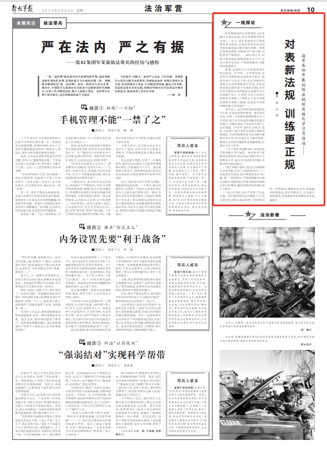 “兵以治为胜,治以严为要,严以法为据。我们要持续向法治要战斗力,充分激发官兵练兵备战热情。”该部作训科一名参谋说,随着依法治训、按纲施训持续推进,基层训练尖子、业务能手持续涌现,营连摸底考核成绩优良率普遍提升。