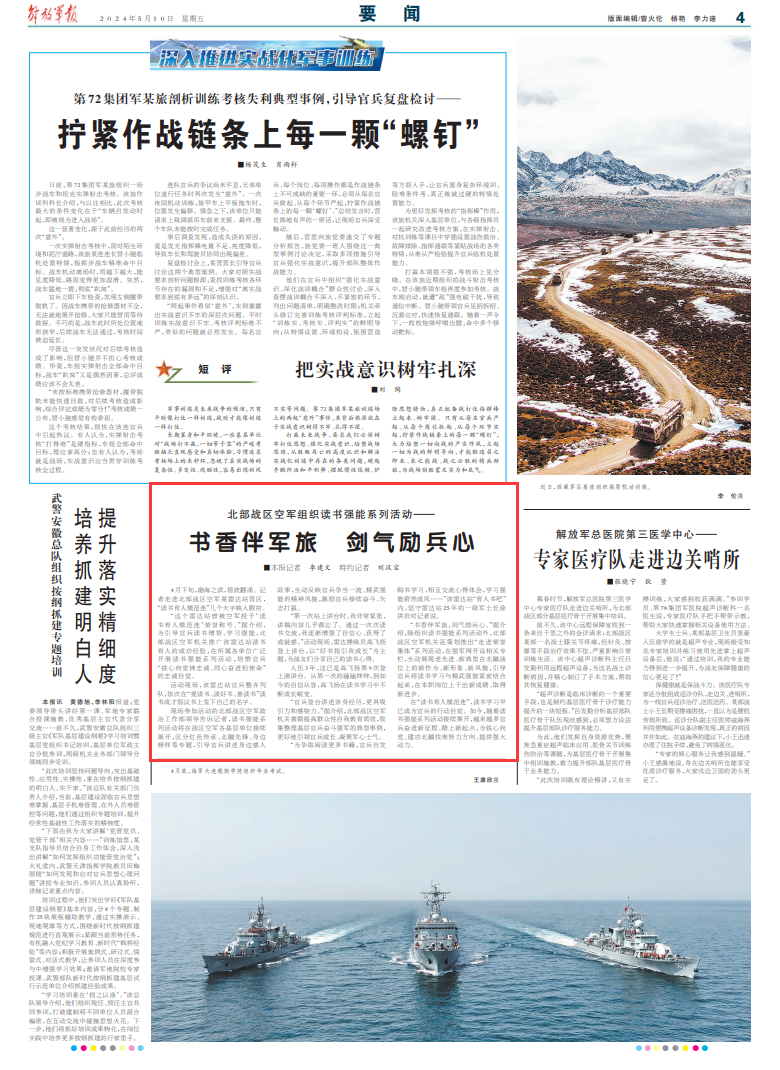 “书香伴军旅,剑气励兵心。”据介绍,除组织读书强能系列活动外,北部战区空军机关还策划推出“走进荣誉集体”系列活动,在强军网开设相关专栏,生动展现老先进、新典型在北疆战位上的新作为、新形象、新风貌,引导官兵将读书学习与精武强能紧密结合起来,在本职岗位上干出新成绩、取得新进步。