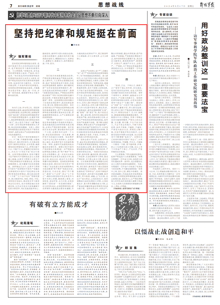 习主席强调:“军队是最讲纪律的,纪律严明是战斗力的重要源泉。”如期实现建军一百年奋斗目标、加快把人民军队建成世界一流军队,是全面建设社会主义现代化国家的战略要求。当前,实现建军一百年奋斗目标到了吃劲奋斗的攻坚期,不可避免地要面临一些难中之难、坚中之坚、硬仗中的硬仗。面对前进道路上风高浪急甚至惊涛骇浪的考验,必须把纪律和规矩挺在前面,让铁规生威、铁纪发力,以严明纪律确保人民军队始终保持强大凝聚力和战斗力,在党和人民需要的时候能够拉得出、上得去、打得赢。