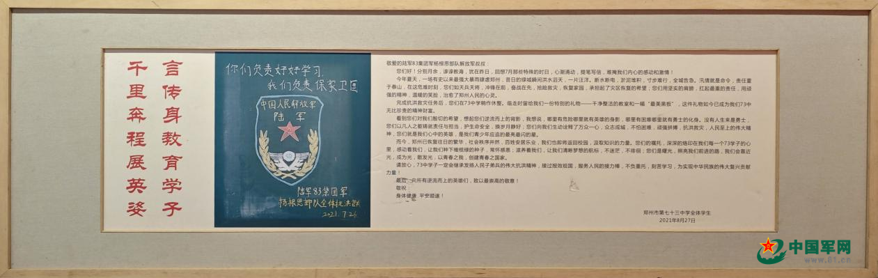 故事还未结束——这年8月30日,郑州市第73中学的老师和学生代表来到连队驻地,感谢部队官兵的无私援助,并将官兵临走时留在第73中学教室的“最美黑板报”做成画框,回赠给部队官兵。