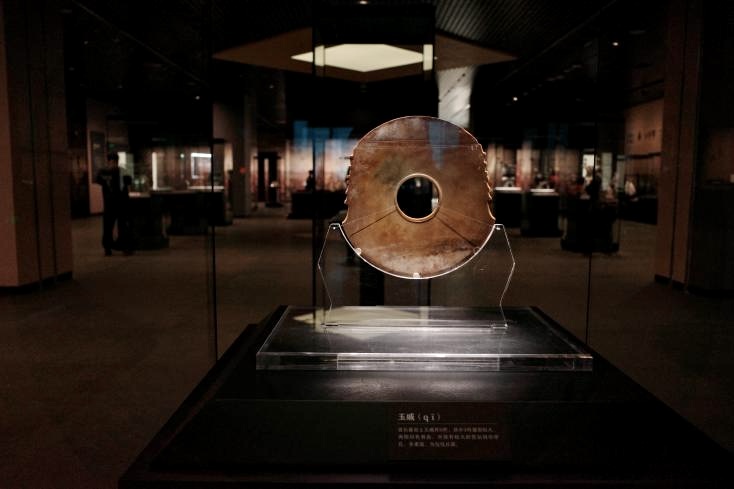 殷墟博物馆新馆内展出的玉戚。人民网记者 刘微摄