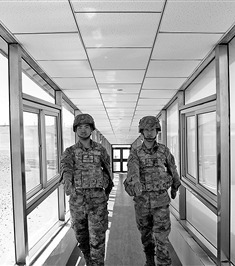 哨兵接岗通过“玻璃长廊”。