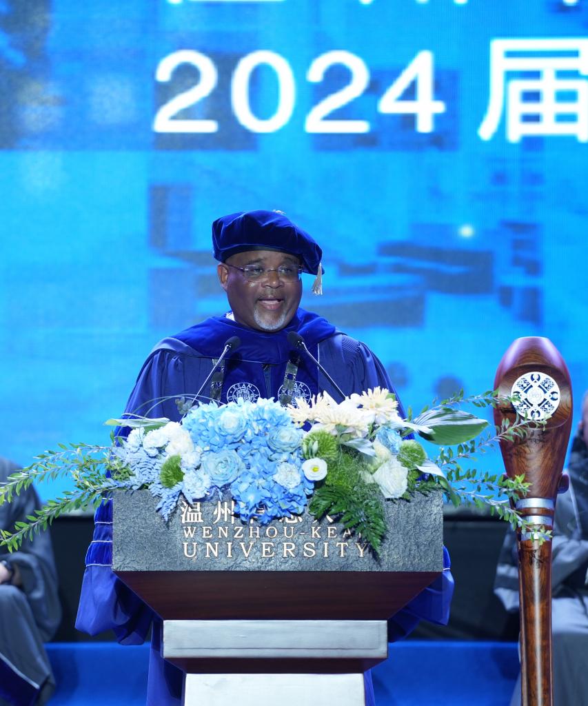 6月7日,美国肯恩大学校长拉蒙·雷波列特在温州肯恩大学毕业典礼上致辞。(受访者供图)